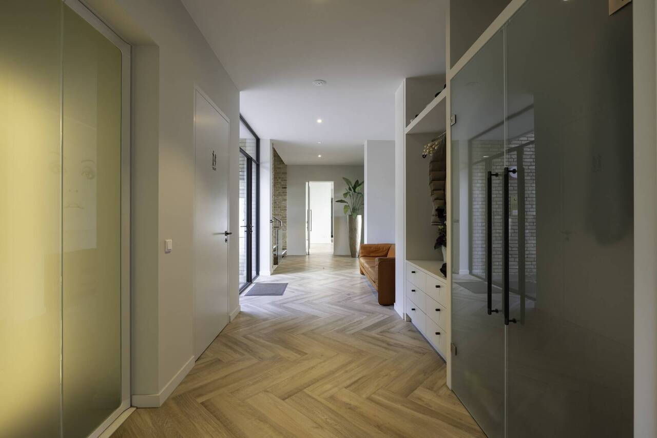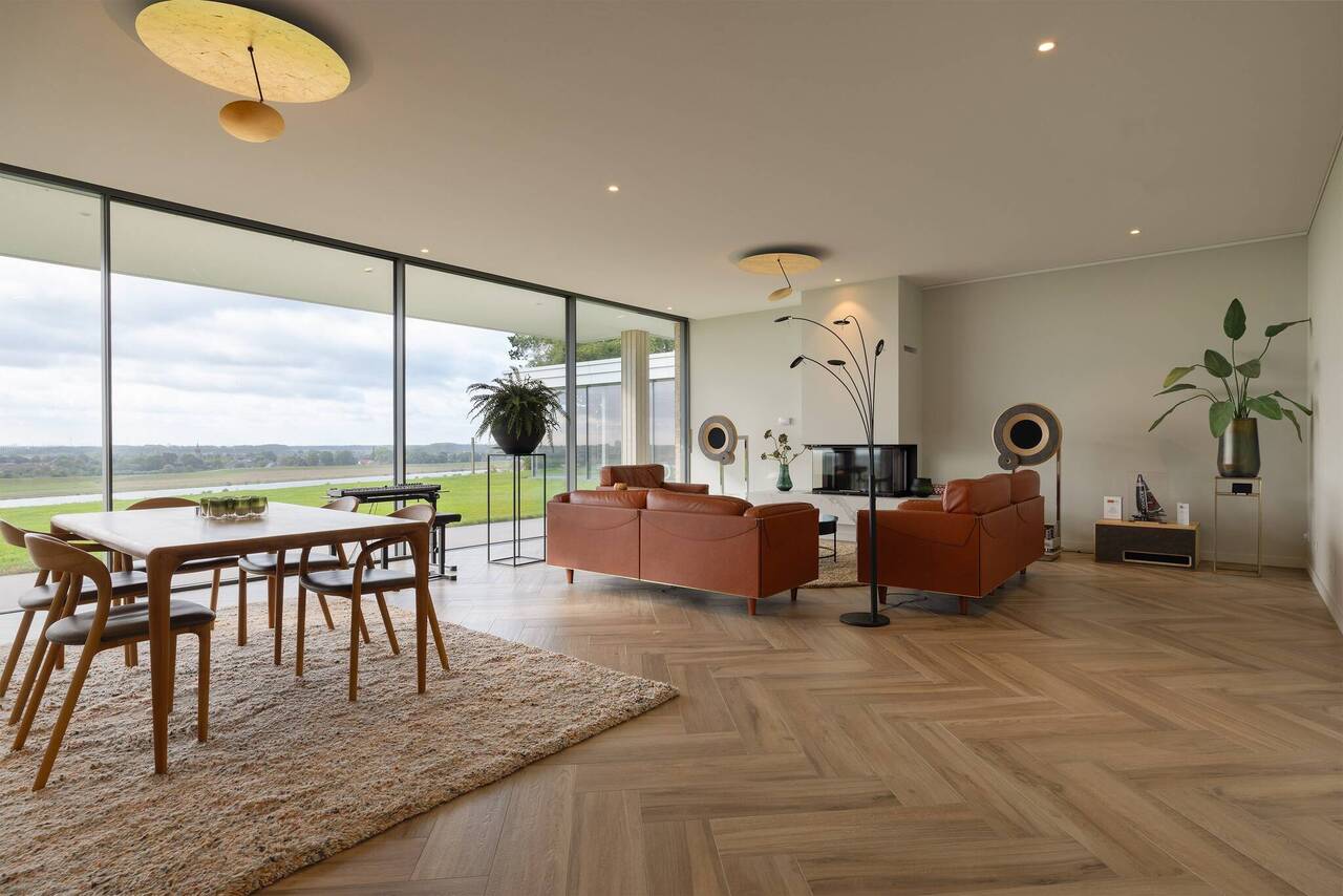 Je komt binnen via de ruime hal, waar de sfeer meteen voelbaar is. Licht, rust en een weids uitzicht over groen en water verwelkomen je zodra je binnenstapt. De hoofdwoonverdieping is een open en luchtige ruimte die gevormd voelt rond het uitzicht zelf.